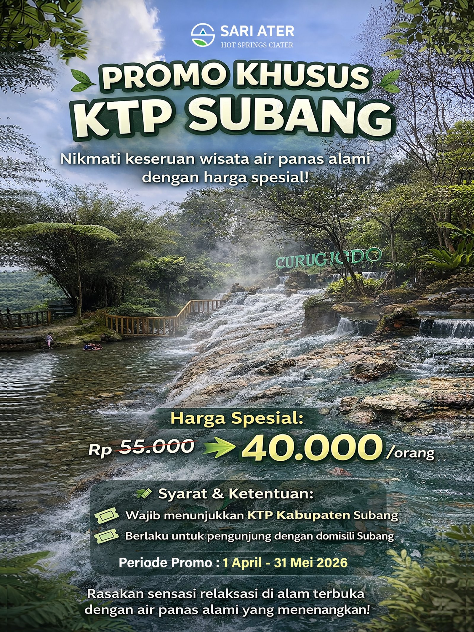 Promo khusus untuk pemilik KTP Subang, nikmati harga spesial masuk area rekreasi pemandian air panas alami dari harga normal Rp55.000 menjadi Rp40.000 per orang yang berlaku untuk weekday maupun weekend, dengan syarat wajib menunjukkan KTP Kabupaten Subang sebagai bukti domisili, berlaku bagi pengunjung berdomisili Subang