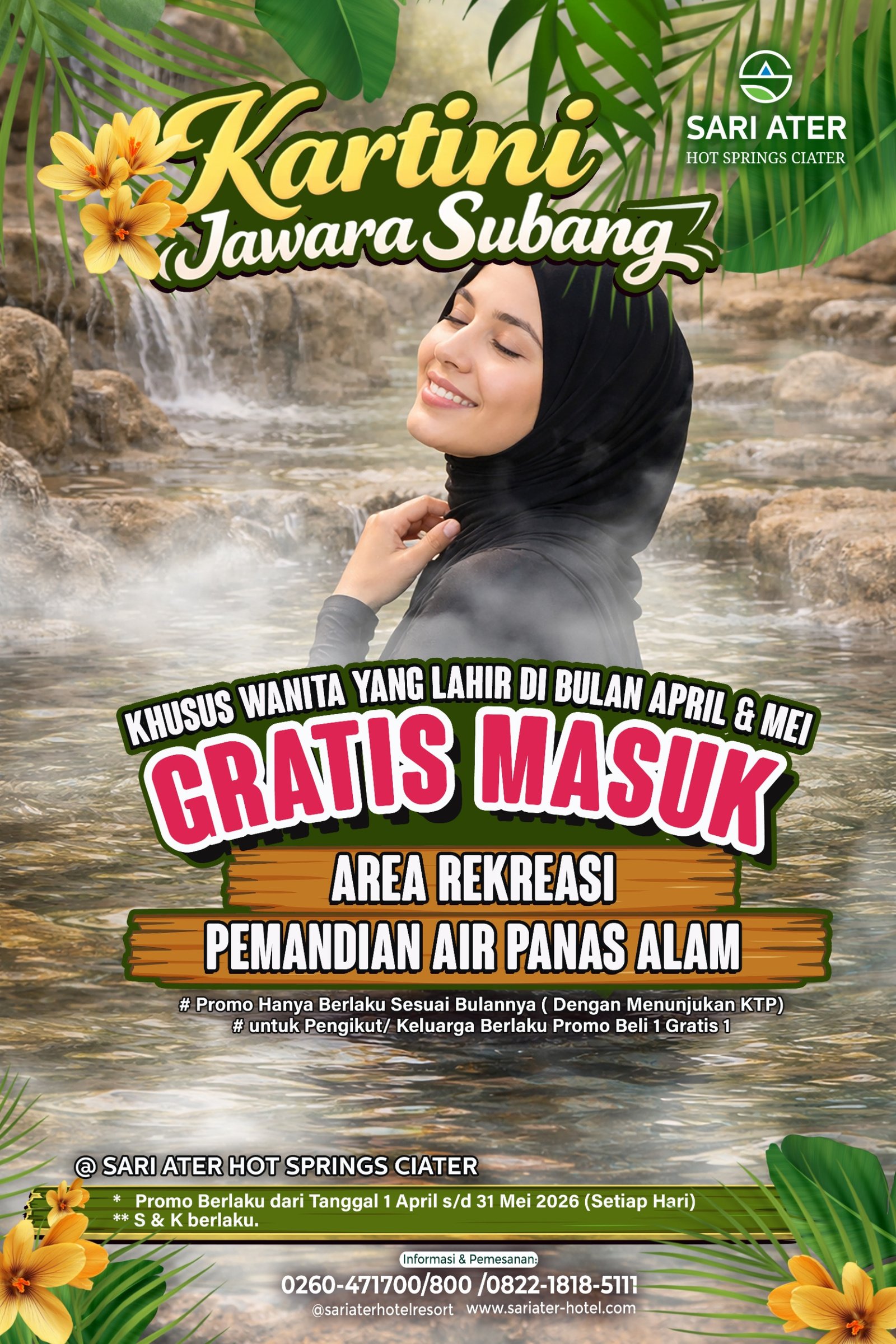 Promo spesial Kartini Jawara Subang, khusus wanita yang lahir di bulan April dan Mei dapat menikmati gratis masuk area rekreasi pemandian air panas alam dengan menunjukkan KTP sebagai bukti, serta bagi keluarga atau pendamping yang ikut tersedia promo Buy 1 Get 1 (Beli 1 Gratis 1) yang berlaku hingga maksimal 10 orang dalam satu rombongan.