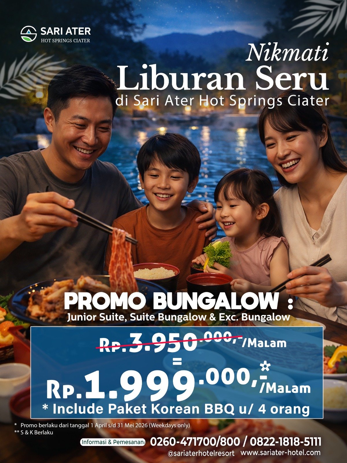 Nikmati liburan seru bersama keluarga di Sari Ater Hot Springs Ciater dengan promo bungalow mulai Rp1.999.000 per malam, sudah termasuk paket Korean BBQ untuk 4 orang—cocok untuk momen santai dan hangat di tengah alam.